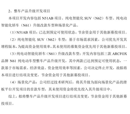 几日前,北汽蓝谷公告称,截至1月31日,公司2023年向特定对象发行股票募集资金拟投资额的60.51亿元,实际已投入34.72亿元。公告内容指出,为提高募集资金的使用效率,北汽蓝谷拟结项及变更三个募投项目。北汽蓝谷表示,基于市场需求因素,公司优先开发纯电智能化SUV(N62)车型增程版本,其未使用的募集资金优先用于其他新募投项目;纯电动智能化轿车(N61)升级改款车型开发内容包括三款ARCFOX品牌N61纯电动车型整车产品升级开发,其中两款已达到预定可使用状态,一款基于市场需求、经济效益等因素,公司决定终止开发。