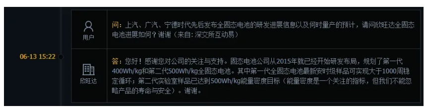 欣旺达发布的消息显示,其自2015年就已经开始研发布局,规划了第一代400Wh/kg和第二代500wh/kg全固态电池。