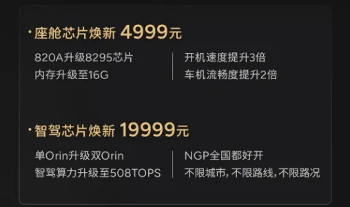 座舱芯片焕新4999元,由820A升级至8295芯片,内存增至16G,开机速度提升3倍,车机流畅度提高2倍;智驾芯片焕新则为19999元,实现单Orin至双Orin的升级,智驾算力跃升至508TOPS。
