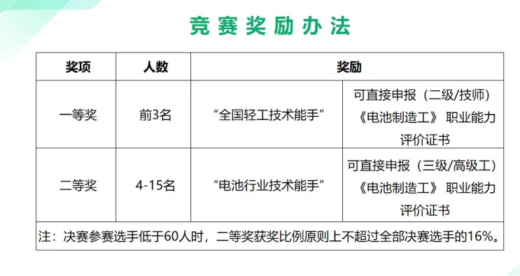 荣誉加冕:获得一等奖的选手将被授予“全国轻工技术能手”称号;二等奖获得者也将有机会成为“电池行业技术能手”。