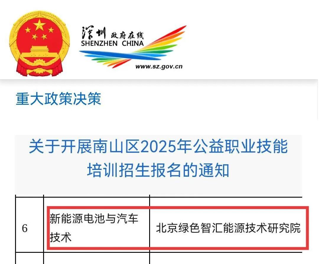 福利开课!!! 新能能源电池与汽车技术公益培训来啦! 只要0元 轻松掌握新技能! 名额仅50个,手慢无! 培训单位 组织机构 主办:深圳市南山区人力资源局 承办:北京绿色智汇能源技术研究院 培训内容 培训信息 01报名费用 7天56课时,全程免费 02报名群体 法定年龄内且满足以下条件之一: ●南山区企业在岗员工; ●南山户籍居民; ● 毕业生; ● 非户籍居民(目前居住在南山区); ● 优先群体(残疾人、退役军人、登记失业人员、港澳台青年)。 03报名资料 南山区企业在岗员工 1.《南山区2025年公益职业技能培训报名表》; 2.身份证正反面照片或复印件; 3.与南山区企业签订一年以上的劳动合同复印件(有企业名称、地址、合同有效期、双方签名等关键页); 4.社保缴纳证明。 1.《南山区2025年公益职业技能培训报名表》; 2.身份证正反面照片或复印件; 3.户口本复印件(含户口本首页)。 注意:居住在南山,户籍不在南山的深圳户籍居民需社区工作站开具的证明。 1.《南山区2025年公益职业技能培训报名表》; 2.身份证正反面照片或复印件; 3.国家统一招生的2025年普通高校应届毕业生提交毕业证(或就读学校提供的《毕业生推荐表》)。 4.国家统一招生的2023、2024年普通高校毕业生未落实工作单位的人员及2023年1月11日至2025年1月8日期间取得国(境)外学历学位且未落实工作单位的留学回国人员提交毕业证和社保打印的未缴纳社保证明。 1.《南山区2025年公益职业技能培训报名表》; 2.身份证正反面照片或复印件; 3.深圳经济特区居住登记信息查询单等政府部门出具的南山居住证明。 相关身份证明。 04报名方式 本次报名提供 移动端和电脑端 两种报名方式 (一)移动端 扫描二维码,进入“Ai南山”小程序“职业技能培训”页面,选择《新能源电池与汽车技术》报名。 (二)电脑端 1.打开浏览器,输入“Ai南山企业服务综合平台”进入官网,或者直接输入网址:https://www.inanshan.org.cn/,点击“登录”进行注册。 2.选择“企业服务”-“人才服务”菜单,进入“人才服务”功能页面,找到“职业技能培训”入口,点击进入“培训活动”列表页面。 05咨询方式 吴老师 15627536091 方老师 15831589360 名额有限,报完即止 赶紧抢占席位 一起来解锁职场新技能吧! <<< END >>>