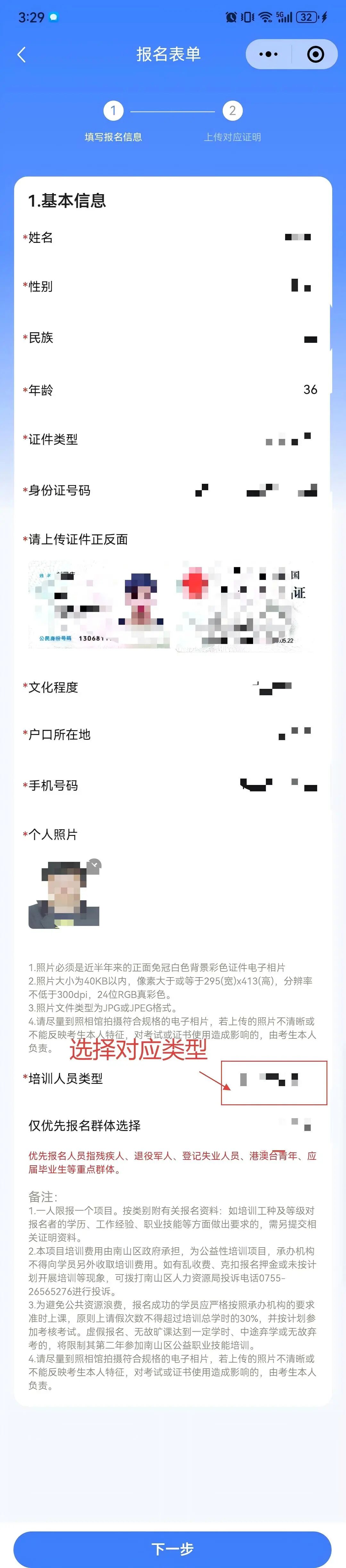 8、在此页面,填写个人信息,上传1寸照片,身份证正反面照片。1